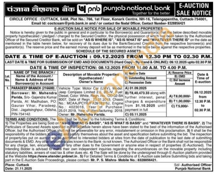 Vehicle Type: Motor Car (LMV), Model: Jeep Compass Limited 2.0, BS-IV, Fuel: Diesel, Color: White, Regni. No.: OD-02-BA 8007, Date of Regn.: 25.01.2019, Chasis No.: MCAAJPCY6JFA39183'8J, Engine No.: 4023016, Year of Purchase: 25.01.2019, Year of Manufacturing: 2018. Owner: Mr. Mahendra Parida.