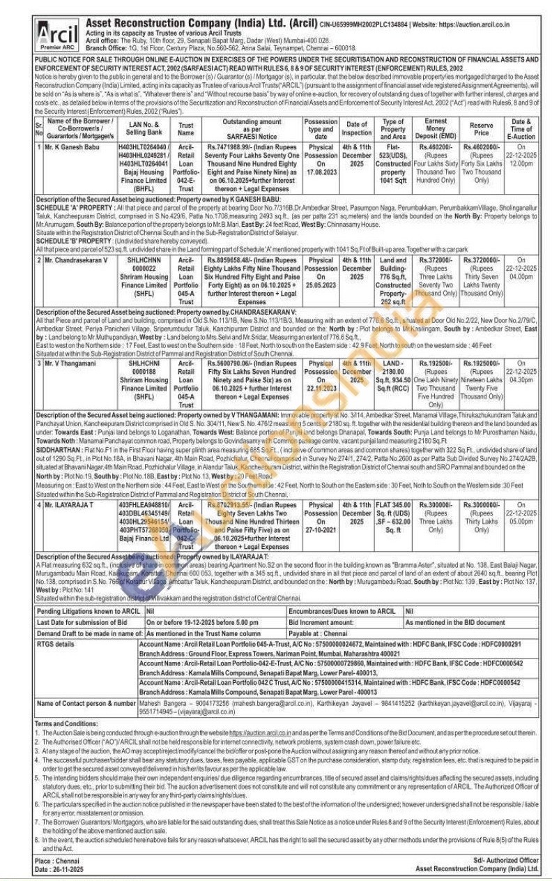 3)Property owned by V THANGAMANI: Immovable property at Ne 3114 Ambedkar St. Manamas Village, Thrukamukundram Tauk.and Panchayat Union, Kancheepuram District comprised in 03. 304/11, New 3. No. 470/25 2100 sq.ft. together with residental bulding thereon and the land bounded an under: Towards East: Punjar and belongs to Loganathan, Towards West: Balance portion of Punjal land belongs Chanapal, Towards South Punja Land belongs to Mr Purasthanan Naidu Towards Noth: Manama Pa yat mad Property belongs to Govindasarty with Commion passage cantine, vacant sunjailand measuring 2180 Sq Ft SIDDHARTHAN: Flat No FT in the First Floor having super slinthara measuring 685 Sq Ft, inclusive of common areas and can share together with 322 Sq. Ft, undivided share of land out of 1296 Sq Ft in Poto 18A, i Bhavans Nagar 4th Main Roat, Pochichalur, Chamal comprised in Survey No 27411, 274/2, Patta o 2600 as per Patta Sub Divided Survey 2742428 tuted a Bhavani Nagar 4th Main Road, Partichalur Vitage, in Alandır Tuk Kancheepura District, wither the Registration District of Chermal south and SRO Pummal and bounded on the North by: Plot No. 15 Southby: Puthi 100 East by: Paths 13. West by: 20 Feet Road Measuring on Eastto West in the Northemside 44 Fest East to West or the Southem sede: 42 Fest North South on the Easlam side 30 Fan tho South the Westemte 30 Ft Situated within the Suti-Registration Detect of Partmal and Registration District of South Chermal