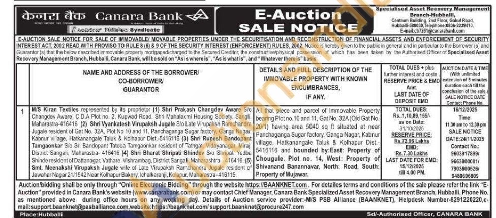 All that piece and parcel of Immovable Property bearing Plot no.10 and 11, Gat No. 32A (Old Gat No. 20/1) having area 5040 sq ft situated at near Panchaganga Sugar factory, Ganga Nagar, Kabnur village, Hatkanangale Taluk & Kolhapur Dist-5416116 and bounded by:East: Property of Chougule, Plot no. 14, West: Property of Shivanand Banannavar, North: Road,