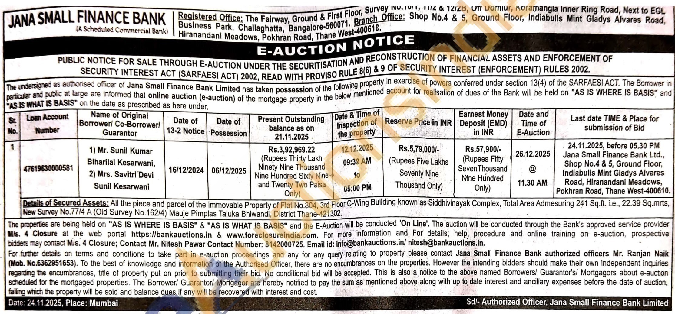Details of Secured Assets: All the piece and parcel of the Immovable Property of Flat No.304, 3rd Floor C-Wing Building known as Siddhivinayak Complex, Total Area Admesuring 241 Sq.ft. i.e., 22.39 Sq.mrts, New Survey No.77/4 A (Old Survey No.162/4) Mauje Pimplas Taluka Bhiwandi, District Thane-421302.