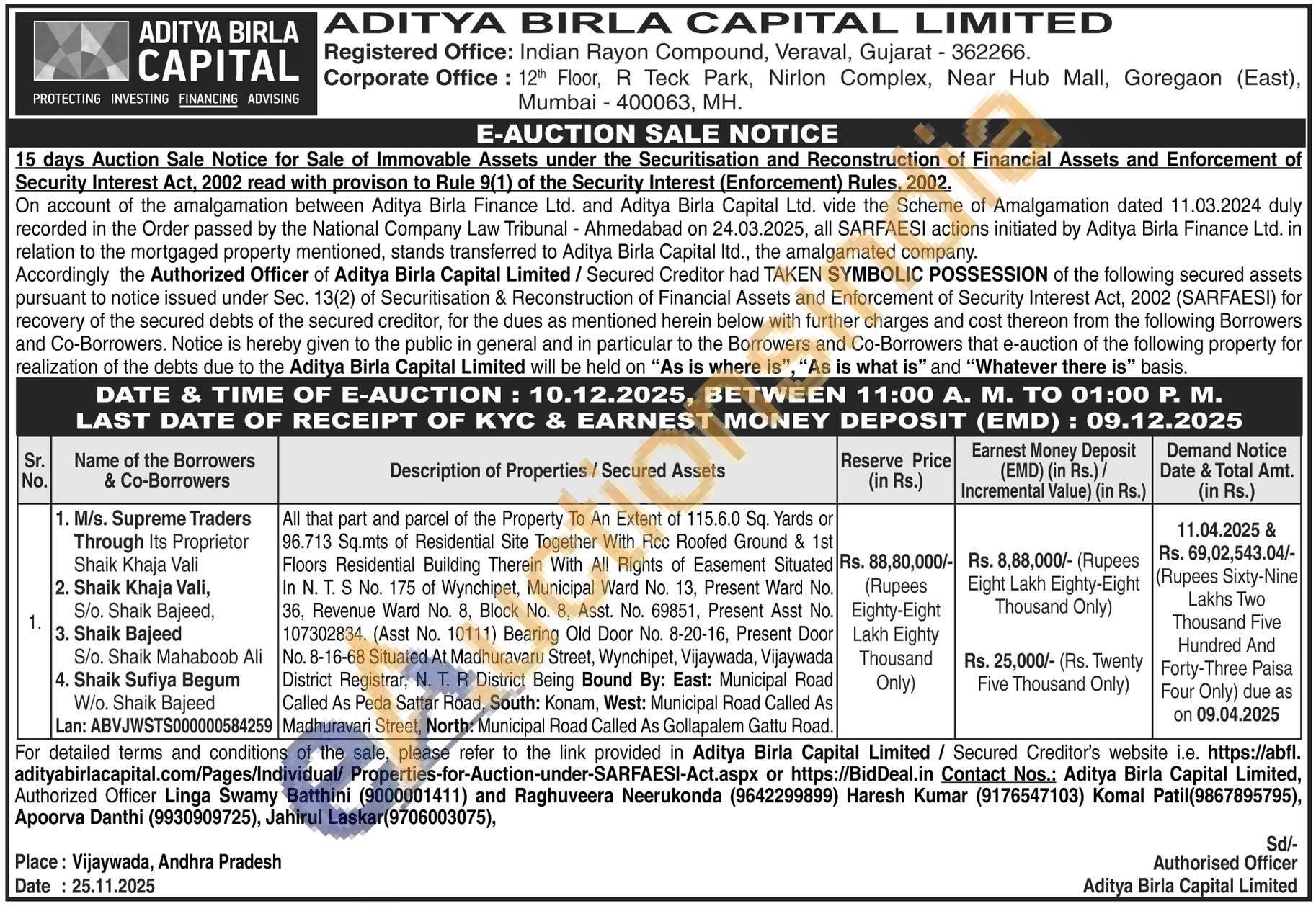 All that part and parcel of the Property To An Extent of 115.6.0 Sq. Yards or 96.713 Sq.mts of Residential Site Together With Rcc Roofed Ground & 1st Ficors Residential Building Therein With All Rights of Easement Situated In N. T. S No. 175 of Wynchipet, Municipal Ward No. 13, Present Ward No. 36, Revenue Ward No. 8, Block No. 8, Asst. No. 69851, Present Asst No. 107302834. (Asst No. 10111) Bearing Old Door No. 8-20-16, Present Door Ali No. 8-16-68 Situated At Madhuravaru Street, Wynchipet, Vijaywada, Vijaywada District Registrar, N. T. R District Being Bound By: East: Municipal Road Called As Peda Sattar Road, South: Konam, West: Municipal Road Called As Madhuravari Street, North: Municipal Road Called As Gollapalem Gattu Road.