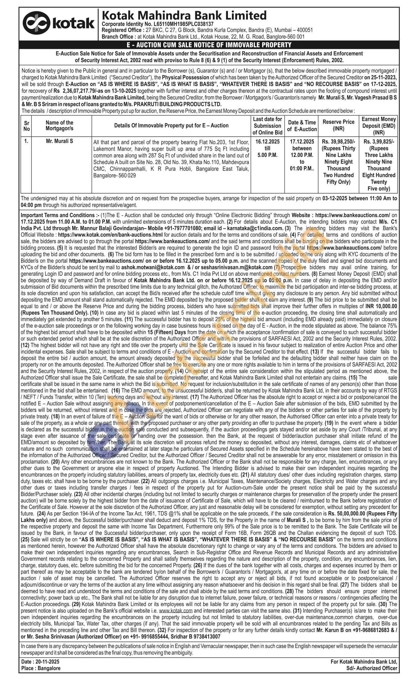 All that part and parcel of the property bearing Flat No.203, 1st Floor, Lakemont Manor, having super built up area of 775 Sq Ft including common area along with 287 Sq Ft of undivided share in the land out of Schedule A built on Site No. 28, Old No. 39, Khata No. 110, Mahdevpura CMC, Chinnappanhalli, KR Pura Hobli, Bangalore East Taluk, Bangalore-560 029