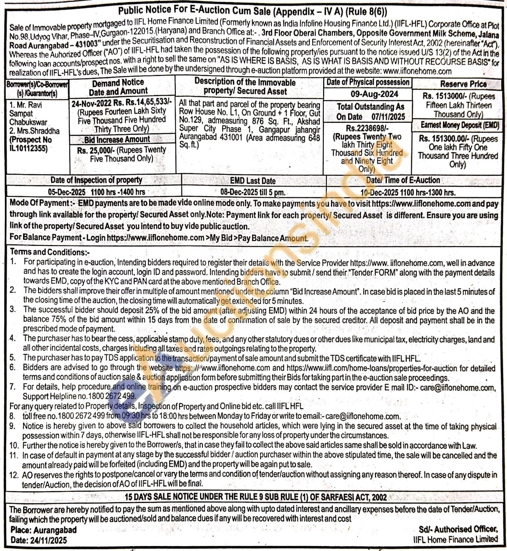 All that part and parcel of the property bearing Row House No. L1, On Ground + 1 Floor, Gut No.129, admeasuring 876 Sq. Ft., Akshad Super City Phase 1, Gangapur jahangir Aurangabad 431001 (Area admeasuring 648 Sq. ft.)