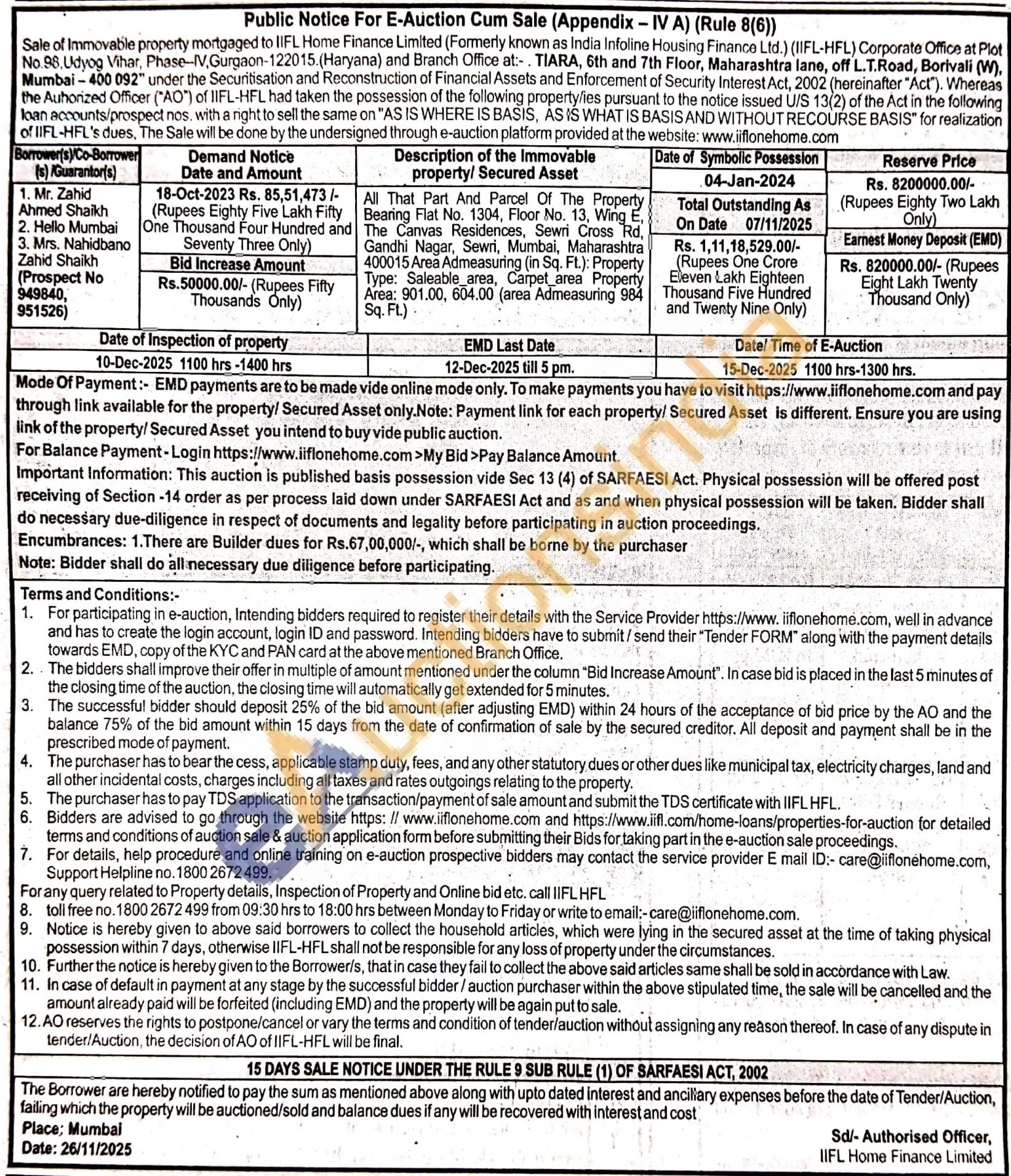All That Part And Parcel Of The Property Bearing Flat No. 1304, Floor No. 13, Wing E, The Canvas Residences, Sewri Cross Rd, Gandhi Nagar, Sewri, Mumbai, Maharashtra 400015 Area Admeasuring (in Sq. Ft.): Property Type: Saleable area, Carpet_area Property Area: 901.00, 604.00 (area Admeasuring 984 Sq. Ft.)