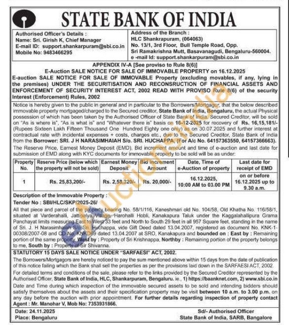 All that piece and parcel of the property bearing No. 58/1/116, Kaneshmari old No. 104/58, Old Khatha No. 116/58/1, situated at Varderahalli, Jattipalya Village, Harohalli Hobli, Kanakapura Taluk under the Kaggalahallipura Grama Panchayat limits measuring East to West 33 feet and North to South 29 feet in all 957 Square feet, standing in the name of Sri. J. H Narasimhaiah Sio Sn. Huchappa, vide Gift Deed dated 13.04.2007, registered as document No. KNK-1-00308/2007-08 and CD No. KNKD69 dated 13.04.2007 at SRO, Kanakapura and bounded on: East by: Remaining portion of the same property, West by: Property of Sri Krishnappa, Northby: Remaining portion of the property belongs to me, South by: Property of Sir Shivanna.