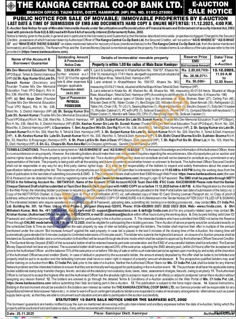 1.Land & building entered in Khata/Kahtoni No. 156/157, Khasra No. . 15&16, measuring 0-17-81 Hects, alongwith superstructure situated at 19.07.2013 at the agreed Mohal Bajuri Khas, Tehsil & Distt. Hamirpur (HP) 2.Land entered in Khata/Khatoni No. 156/157, Khasra No. 360 measuring 00-09-21 Hects. situated at Mohal Bajuri Khas Tehsil & Distt. Hamirpur (HP) 3. Land entered in Khata No. 46, Khatoni No. 46, Khasra No. 166, measuring 00-01-54 Hects. Situated at Village Rara, Moza Bajuri, Tehsil & Distt. Hamirpur (HP) (According to old Khata No. 6, Kahtoni No. 6, Khasra No. 186) 4. Hypothecated various types of Stocks lying in the premises le. Book Shelves Steel (27), Ceiling Fan (46), Wooden Desk (479), Water Cooler (1), Bed Single (32), Wooden Almirah (19), Steel Almirah (16), Refrigerator (2). Table (14), Chair (18), TV LG (1), Sewing Machine (1), Washing Machine (1), Electric Geyser (1). Sofa Set 10 seater (1), Wooden Cabinet (1), PC with UPS (1), Sofa set 5 seater (1). Printer (HP (1), Compact Monitor with keyboard (1)Water Cooler (1), Monitor with Table (19), CPU (7), Revolving chair (18), Sofa set 3 seater(1)
