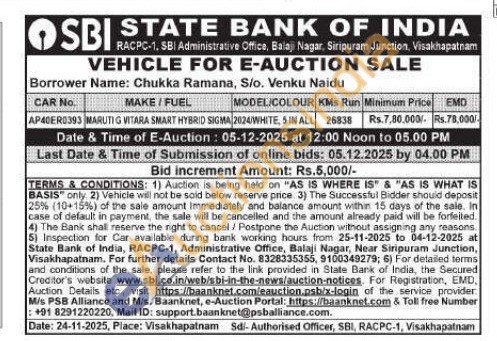 CAR No. MAKE/FUEL MODEL/COLOUR KMS Run AP40ER0393 MARUTIG VITARA SMART HYBRID SIGMA 2024/WHITE, 5 IN ALL 26838