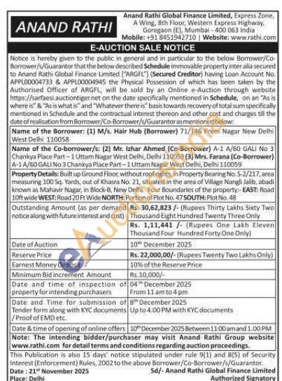 Property Details: Built up Ground Floor, without roof rights, in Property Bearing No. 5-2/217, area measuring 100 Sq. Yards, out of Khasra No. 21, situated in the area of Village Nangli Jalib, abadi known as Mahavir Nagar, in Block-B, New Delhi, Four Boundaries of the property:-EAST: Road 10ft wide WEST: Road 20 Ft Wide NORTH: Portion of Plat No. 47 SOUTH: Plot No.48