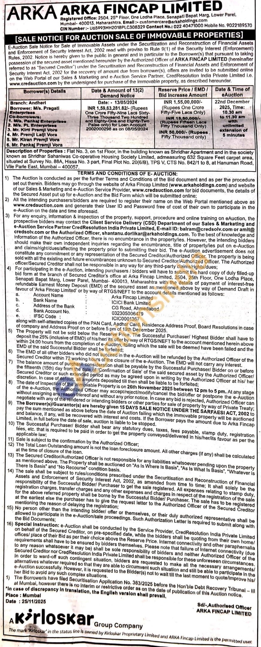 Description of Properties: Flat No. 3, on 1st Floor, in the building known as Shridhar Apartment and in the society known as Shridhar Sahaniwas Co-operative Housing Society Limited, admeasuring 632 Square Fer Feet carpet area, situated at Survey No. 88A, Hissa No. 3 part, Final Plot No. 20(6/B), TPS V, CTS No. 842/1 to 8, at Hanuman Road, Vile Parle East, Mumbai-400057