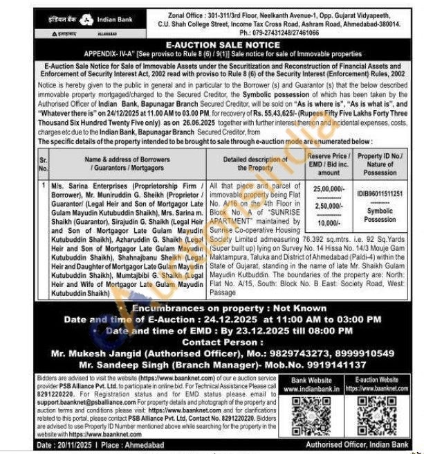 All that piece and parcel of immovable property being Flat No. A/16 on the 4th Floor in Block No. A of 'SUNRISE APARTMENT maintained by Sunrise Co-operative Housing Society Limited admeasuring 76.392 sq.mtrs. i.e. 92 Sq. Yards (Super built up) lying on Survey No. 14 Hissa No. 14/3 Mouje Gam Maktampura, Taluka and District of Ahmedabad (Paldi-4) within the State of Gujarat, standing in the name of late Mr. Shaikh Gulam Mayudin Kutbuddin. The boundaries of the property are: North Flat No. A/15, South: Block No. B East: Society Road, West: Passage