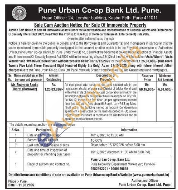 All that piece and parcel of the land situated within the registration district of pune sub District of taluka Havel and within the limits of Pune Municipal corporation and within the jurisdiction of joint Sub registrar haveli bearing S.No. 63/2/B. flat No. 12, located on first floor (as per agreement) second floor (actual) adm, Area about 512 sq.ft. le. 47.58 sq. Mrs. (Built up) in the building named as Indranil Condominium apartment constructed on the land described in (A) above together with the share in common area and facilities and all appurtenances annexed therelo