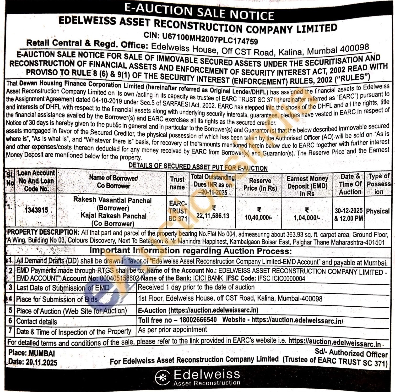 PROPERTY DESCRIPTION: All that part and parcel of the property bearing No.Flat No 004, admeasuring about 363.93 sq. ft. carpet area, Ground Floor, A Wing, Building No 03, Colours Discovery, Next To Betegaon & Nr Mahindra Happinest, Kambalgaon Boisar East, Palghar Thane Maharashtra-401501