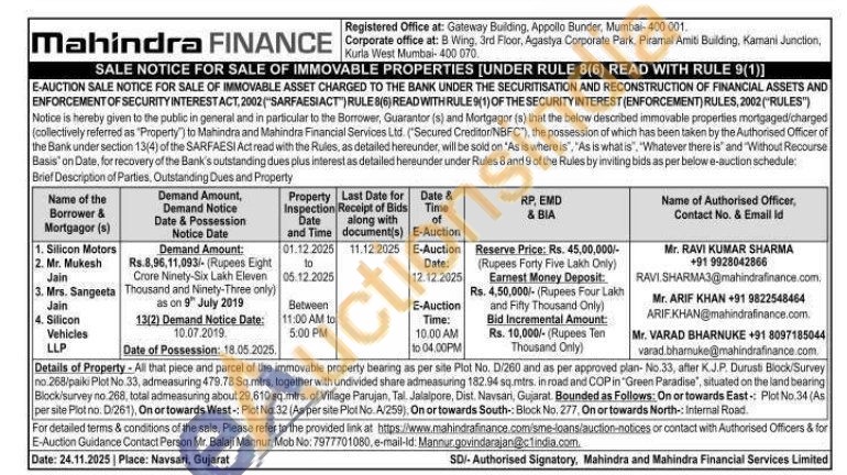 Details of Property - All that piece and parcel of the immovable property bearing as per site Plot No. D/260 and as per approved plan-No.33, after K.J.P. Durusti Block/Survey no.268/paiki Plot No. 33, admeasuring 479.78 Sq.mtrs, together with undivided share admeasuring 182.94 sq.mtrs. in road and COP in "Green Paradise", situated on the land bearing Block/survey no. 268, total admeasuring about 29,610 sq.mirs. of Village Parujan, Tal. Jalalpore, Dist. Navsari, Gujarat. Bounded as Follows: On or towards East: Plot No.34 (As per site Plot no. D/261), On or towards West-: Plot No. 32 (As per site Plot No. A/259). On or towards South-: Block No. 277, On or towards North-: Internal Road.
