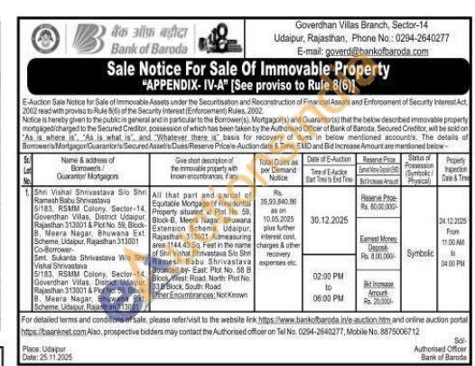 All that part and parcel of Equitable Mongage Montage of of Residential Residential Property situated at Plot No. 58 Bkk-B. Meera Nagar, Bhuwaна Extension Scheme. Udaipur Rajasthan 313001 Admeasuring area 1144.43 Sq. Feet in the name of Shri Vishal Shrivastava Silo Shin Ramesh Babu Shrivastava Bounded by- East: Pkt No. 58 8 Block, West Road North Plist No 33 8 Block South Road
