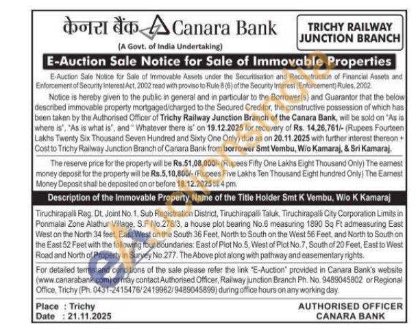 Tiruchirapalli Reg. Dt, Joint No. 1, Sub Registration District, Tiruchirapalli Taluk, Tiruchirapalli City Corporation Limits in Ponmalai Zone Alathur Village, S.F No.278/3, a house plot bearing No.6 measuring 1890 Sq Ft admeasuring East West on the North 34 feet, East West on the South 36 Feet, North to South on the West 56 Feet, and North to South an the East 52 Feet with the following four boundaries: East of Plot No.5, West of Plot No.7, South of 20 Feet, East to West Road and North of Property in Survey No. 277. The Above plot along with pathway and easementary rights.