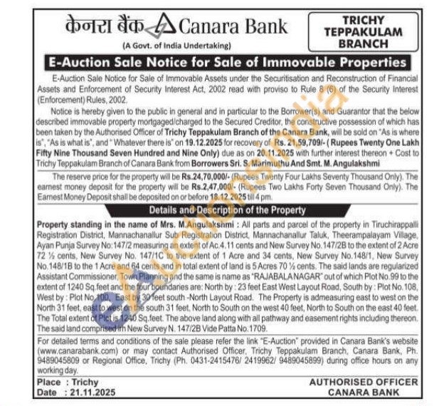Property standing in the name of Mrs. M.Angulakshmi: All parts and parcel of the property in Tiruchirappalli Registration District, Mannachanallur Sub Registration District, Mannachanallur Taluk, Theerampalayam Village, Ayan Punja Survey No: 147/2 measuring an extent of Ac.4.11 cents and New Survey No. 147/28 to the extent of 2 Acre 72% cents, New Survey No. 147/1C to the extent of 1 Acre and 34 cents, New Survey No.148/1, New Survey No. 148/18 to the 1 Acre and 64 cents and in total extent of land is 5 Acres 70% cents. The said lands are regularized Assistant Commissioner, Town Planning and the same is name as "RAJABALANAGAR" out of which Plot No.99 to the extent of 1240 Sq. feet and the four boundaries are: North by: 23 feet East West Layout Road, South by: Plot No. 108, West by: Plot No. 100, East by 30 feet south-North Layout Road. The Property is admeasuring east to west on the North 31 feet, east to west on the south 31 feet, North to South on the west 40 feet, North to South on the east 40 feet. The Total extent of Plot is 1240 Sq. feet. The above land along with all pathway and easement rights including thereon. The said land comprised irh New Survey N. 147/2B Vide Patta No. 1709