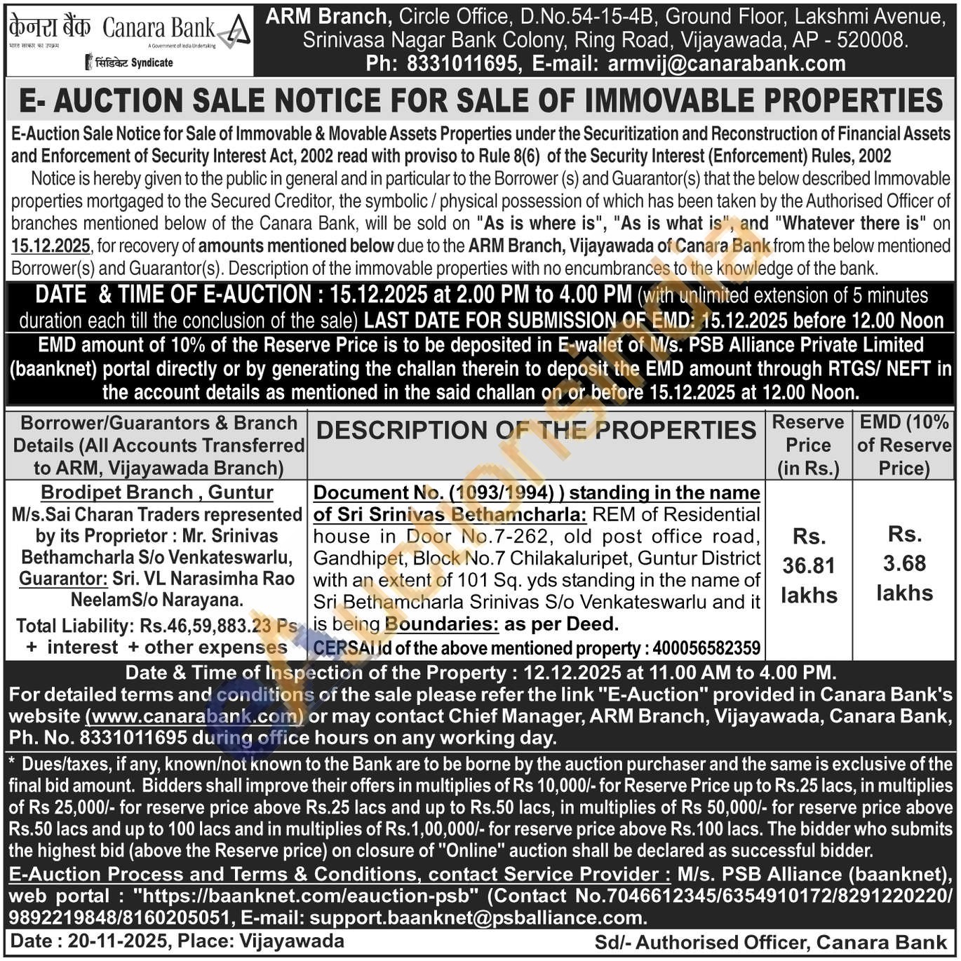 Document No. (1093/1994)) standing in the name of Sri Srinivas Bethamcharla: REM of Residential house in Door No.7-262, old post office road, Gandhipet, Block No.7 Chilakaluripet, Guntur District with an extent of 101 Sq. yds standing in the name of Sri Bethamcharla Srinivas S/o Venkateswarlu and it is being Boundaries: as per Deed.
