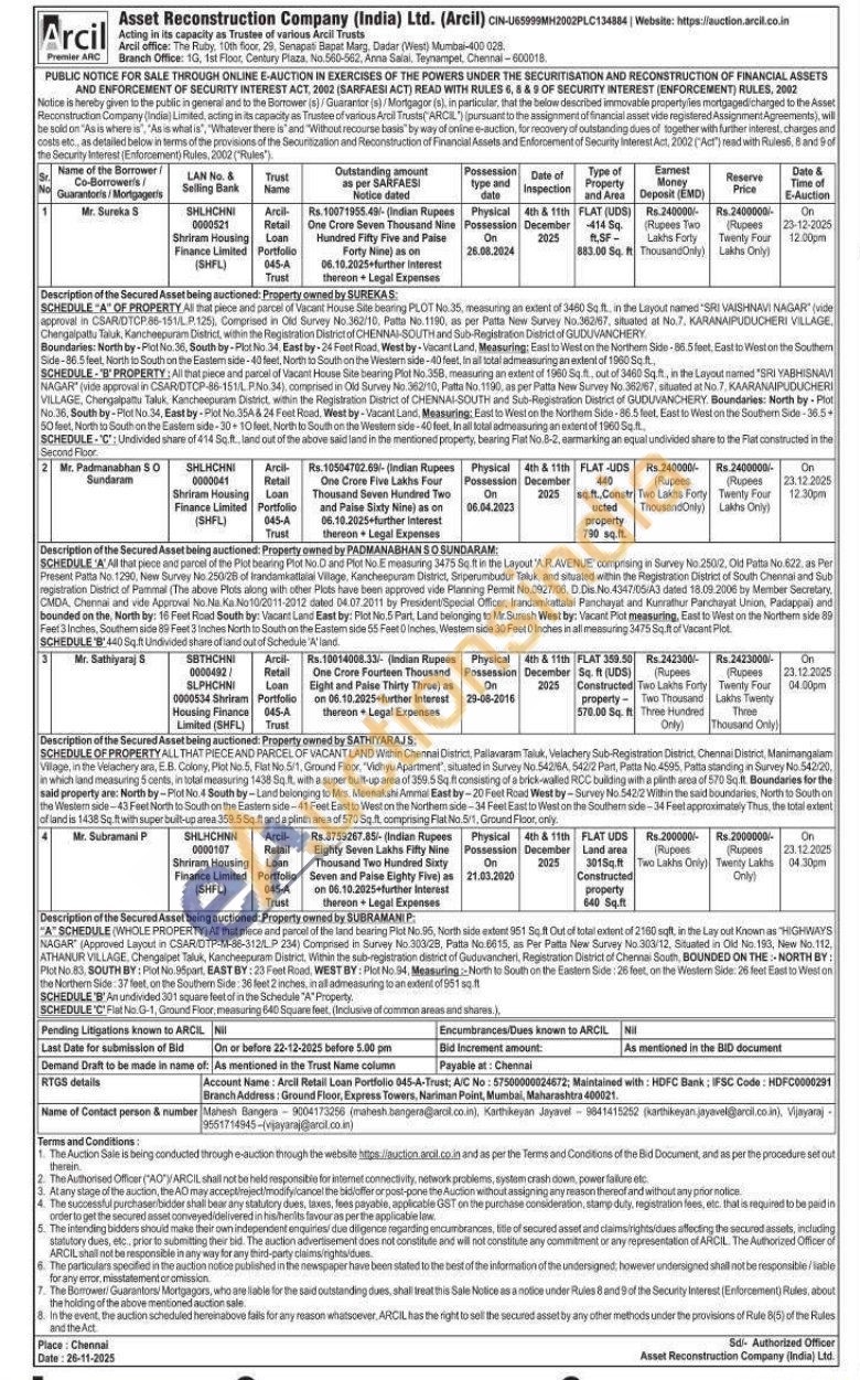 3) ALL THAT PIECE AND PARCEL OF VACANT LAND Within Chennal District, Pallavaram Taluk, Velachery Sub-Registration District, Chennai District, Manimangalam Village, in the Velachery ara, E.B. Colony, Plot No. 5, Flat No 5/1, Ground Floor, "Vidhyu Apartment", situated in Survey No.542/6A, 542/2 Part, Patta No 4595, Patta standing in Survey No.542/20, in which land measuring 5 cents, in total measuring 1438 Sq ft, with a super built-up area of 359.5 Sq.ft consisting of a brick-walled RCC building with a plinth area of 570 Sq.ft. Boundaries for the said property are: North by-Plot No.4 South by-Land belonging to Mrs. Meenakshi Ammal East by-20 Feet Road West by-Survey No 542/2 Within the said boundaries, North to South on the Western side-43 Feet North to South on the Eastern side-41 Feet East to West on the Northem side-34 Feet East to West on the Southem side-34 Feet approximately Thus, the total extent of land is 1438 Sq.ft with super bult-up area 359.5 Sq.ft and a plinth area of 570 Sq.ft. comprising Flat No.5/1, Ground Floor, only.