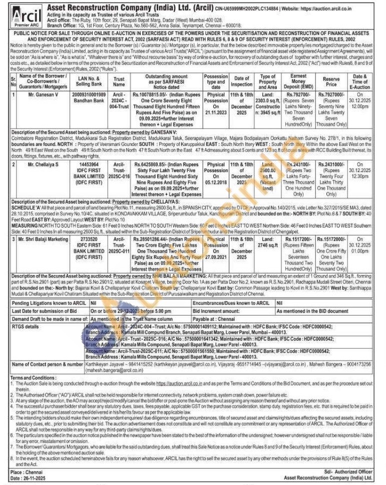 3)All that piece and parcel of land measuring an extent of 1 Ground and 346 Sq.ft. forming part of R.S.No.2901 (part) as per Patta R.S.No 2901/2, situated at Kosapet Village, bearing Door No. 1A as per Patta Door No.2, known as R.S.No.2901, Radhappa Mudali Street Otten, Chennai and bounded on the:-North by: Bajanai Kovil & Chellapariyar Kovil Chatiram South by: Chellapariyar Kovil East by: Common Passage leading to Kovil in R.S.No.2901 West by: Santhiappa Mudali & Chellapariyar Kovil Chatiram Situated within the Sub-Registration District of Purusawalkam and Registration District of Chennai.