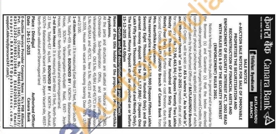 Name of the title holder of the property is Mrs. Keerthika Ayyakannu. All the parts and structures are situated in Madurai South SRD, Cholavandan Sub-Registration Office, and Usilampatti Taluk Vikramangalam Village. Old S.No. 45/8A1 and 45/7C1 in subdivision S.No.45/8A1A and 45/7C1. New S.No. 45/23 and 45/7c1b in patta No.3559, House with vacant site Housing bearing Door No's :2/99 and 2/100. 1-st item House: It is measuring East-West 17 feet, North-South 27 feet, Totally-459 sq. feet. BOUNDED BY: NORTH- Balasaraswathi House, SOUTH- Vikramangalam-Kovilpatti Road, EAST- Jeyam House, WEST-North-South vaikkal and shanmugavel land. 2-nd item House: It is measuring East-West 19 feet, North-South 23 feet, Totally-437 sq.feet. BOUNDED BY: NORTH- Authukal, SOUTH-Balasaraswathi Vacant site, EAST- Jeyam Vacant site, WEST-North-South vaikkal and Shanmugavel land