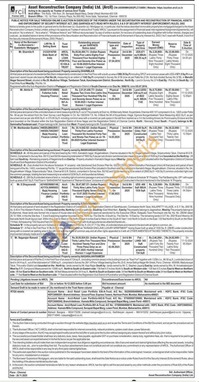 1) All that piece and parcel of a residential flat (Semi-independent) constructed on the First Floor with a built-up area of 999.35 Sq.Ft including OPGT and common areas with UDS of 671.5 Sq.Ft in an approved vacant house site bearing Plot No.2A, measuring to an extent of 1343 Sq.Ft comprised in Survey No. 3/18 (now as per Patta No 2124, the Sub-divided Survey No 3/1B), in Maruthi Nagar Second Street, situated at No.29, Mudichur Village, Tambaram Taluk, Kancheepuram District, Boundaries: North By: Land in Survey No 3/1A East By: Plot No SA South By: 24 Feet Wide Road West By: Plot No. 1A