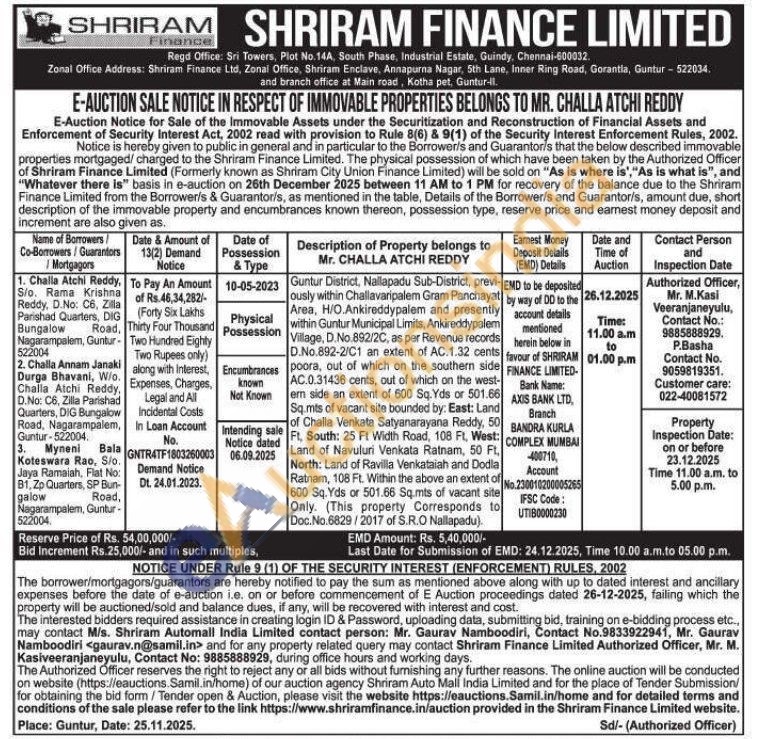 Guntur District, Nallapadu Sub-District, previ-ously within Challavaripalem Gram Panchayat Area, H/O.Ankireddypalem and presently within Guntur Municipal Limits, Ankireddypalem Village, D.No.892/2C, as per Revenue records D.No.892-2/C1 an extent of AC.1.32 cents poora, out of which on the southern side AC.0.31436 cents, out of which on the west-em side an extent of 600 Sq. Yds or 501.66 Sq.mts of vacant site bounded by: East: Land of Challa Venkata Satyanarayana Reddy, 50 Ft. South: 25 Ft Width Road, 108 FL, West: Land of Navuluri Venkata Ratnam, 50 Ft, North: Land of Ravilla Venkataiah and Dodia Ratnam, 108 Ft. Within the above an extent of 600 Sq. Yds or 501.66 Sq.mts of vacant site Only. (This property Corresponds to Doc.No.6829/2017 of S.R.O Nallapadu
