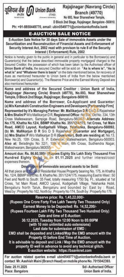 All that piece and parcel of Residential House Property bearing No. 175, in Khatha No. 12/4, BBMP Ward No. 8. Khatha No. 351/12/4/175, measuring East to West: 50 Feet and North to South: 35 Feet, totally measuring 1750 Sq. Ft, situated at 1st Cross, 1st Main Road, AMCO Layout, Kodigehalli Village, Yelahanka Hobli, Bengaluru North Taluk, Bengaluru and bounded by: East by Road, West by: Property No 162, North by: Property No 174, South by: Property No 176.
