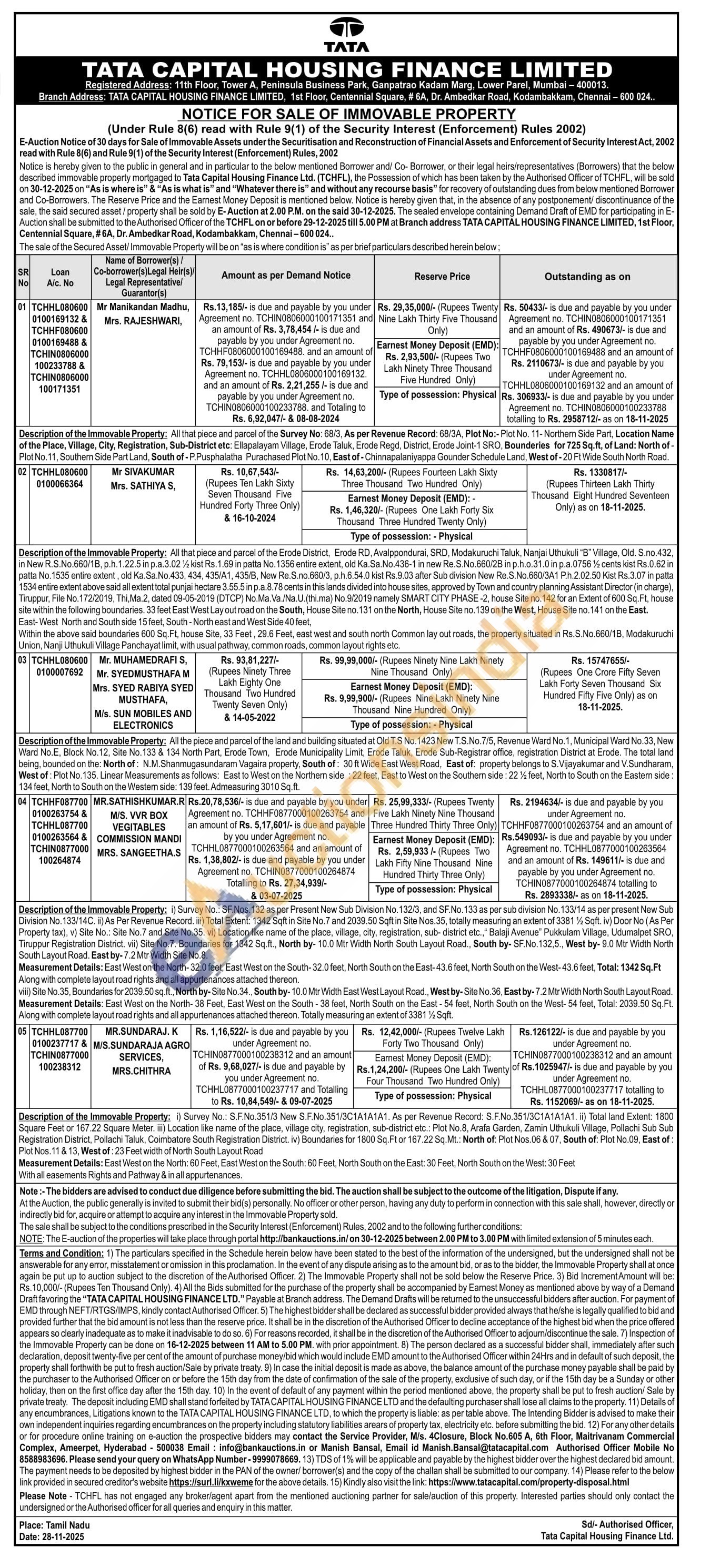 All the piece and parcel of the land and building situated at Old T.S No. 1423 New T.S. No.7/5, Revenue Ward No. 1, Municipal Ward No.33, New Ward No.E, Block No.12, Site No.133 & 134 North Part, Erode Town, Erode Municipality Limit, Erode Taluk, Erode Sub-Registrar office, registration District at Erode. The total land being, bounded on the: North of: N.M.Shanmugasundaram Vagaira property, South of: 30 ft Wide East West Road, East of: property belongs to S. Vijayakumar and V.Sundharam, West of: Plot No. 135. Linear Measurements as follows: East to West on the Northern side: 22 feet, East to West on the Southern side: 22½ feet, North to South on the Eastern side: 134 feet, North to South on the Western side: 139 feet. Admeasuring 3010 Sq.ft