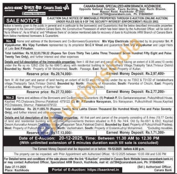 Item 1: All that part and parcel of land having an extent of 4.05 ares(10 cents) under the Re sy no 128/2 (Old Sy No 696/7) along with residential building in Vadakkethara Village, Thalapilly Taluk, Thrissur District Bounded by: North: Property of Mr Mohammed, South: Passage, East: Road, West: Property of Kullan