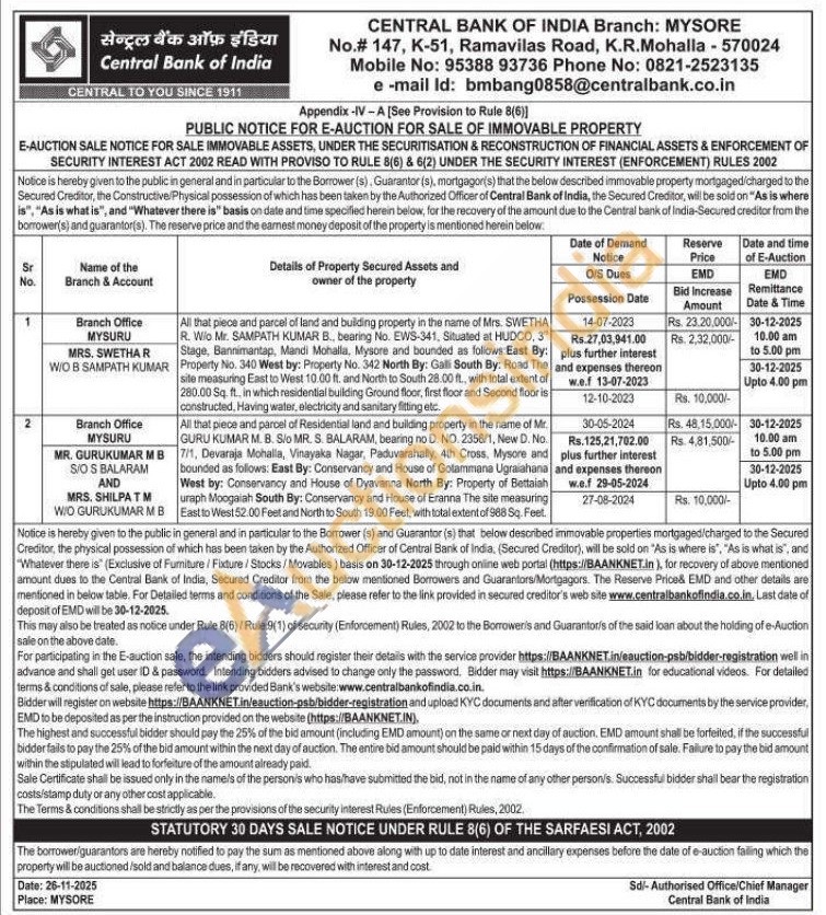 All that piece and parcel of Residential land and building property in the name of Mr. GURU KUMAR M. B. Sio MR. S. BALARAM, bearing no D. NO. 2356/1, New D. No. 7/1, Devaraja Mohalla, Vinayaka Nagar, Paduvarahally, 4th Cross, Mysore and bounded as follows: East By: Conservancy and House of Gotammana Ugralahana West by: Conservancy and House of Dyavanna North By: Property of Bettaiah uraph Moogaiah South By: Conservancy and House of Eranna The site measuring East to West 52.00 Feet and North to South 19.00 Feet, with total extent of 988 Sq. Feet.