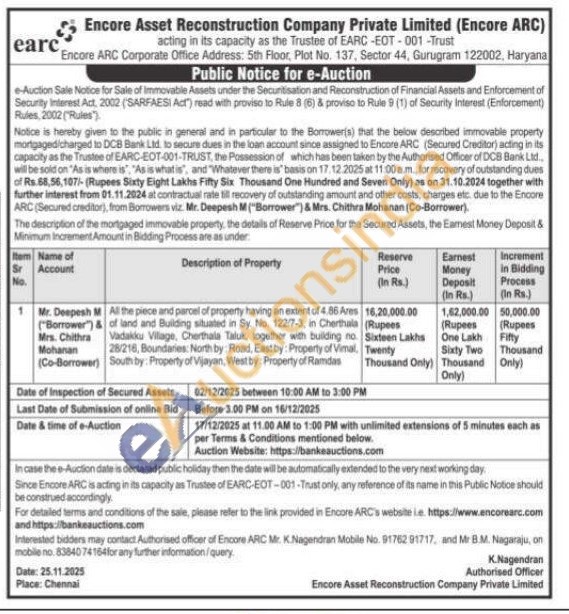 All the piece and parcel of property having an extent of 4.86 Ares of land and Building situated in Sy. No. 122/7-3, in Cherthals Vadakku Vilage, Cherthala Taluk, together with building no 28/216, Boundaries: North by Road, East by: Property of Vimal. South by: Property of Vijayan, West by Property of Ramdas