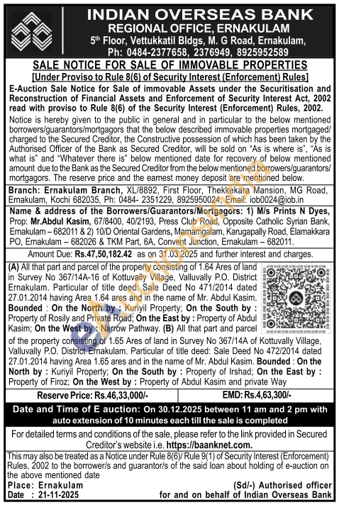 All that part and parcel of the property consisting of 1.64 Ares of land in Survey No 367/14A-16 of Kottuvally Village, Valluvally P.O. District Ernakulam. Particular of title deed: Sale Deed No 471/2014 dated 27.01.2014 having Area 1.64 ares and in the name of Mr. Abdul Kasim. Bounded: On the North by Kuriyil Property; On the South by: Property of Rosily and Private Road; On the East by: Property of Abdul Kasim; On the West by: Narrow Pathway. (B) All that part and parcel of the property consisting of 1.65 Ares of land in Survey No 367/14A of Kottuvally Village, Valluvally P.O. District Ernakulam. Particular of title deed: Sale Deed No 472/2014 dated 27.01.2014 having Area 1.65 ares and in the name of Mr. Abdul Kasim. Bounded: On the North by Kuriyil Property; On the South by Property of Irshad; On the East by: Property of Firoz; On the West by: Property of Abdul Kasim and private Way