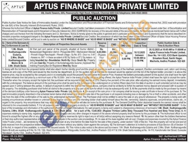 All that part and parcel of the property situated at Guntur district Narasarsopet Registration district-Paugurala SRO-Machavaram Mandal Pinneli Village Panchayath-Pinnelli vilage Sy No. 873 Doar no. 5-47 Assess no. 847 in these an extent of 80 Sq Yards or 67.2 Sq meters is being bounded by:- Boundaries: North By: Bazar South By: Property of S. Jani East By: Property of Sk. Kodamagundia Gulama (Applicant Re-maining Propedy But Ue Registered West By Bazar