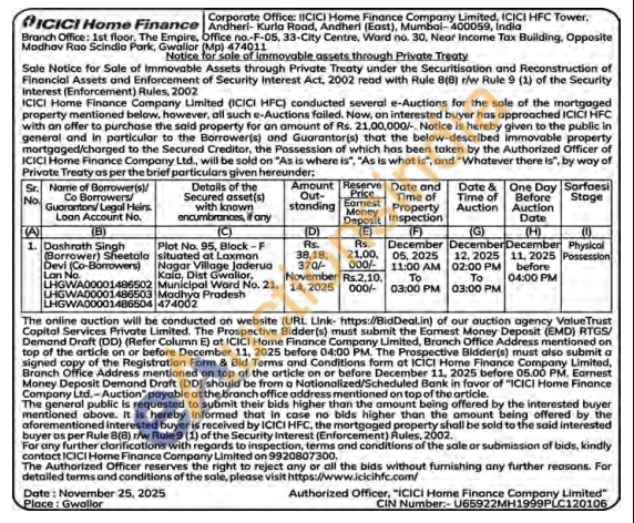 Plot No. 95, Block-F situated at Laxman Nagar Village Jaderua Kala, Dist Gwalior, Municipal Ward No. 21. Madhya Pradesh 474002