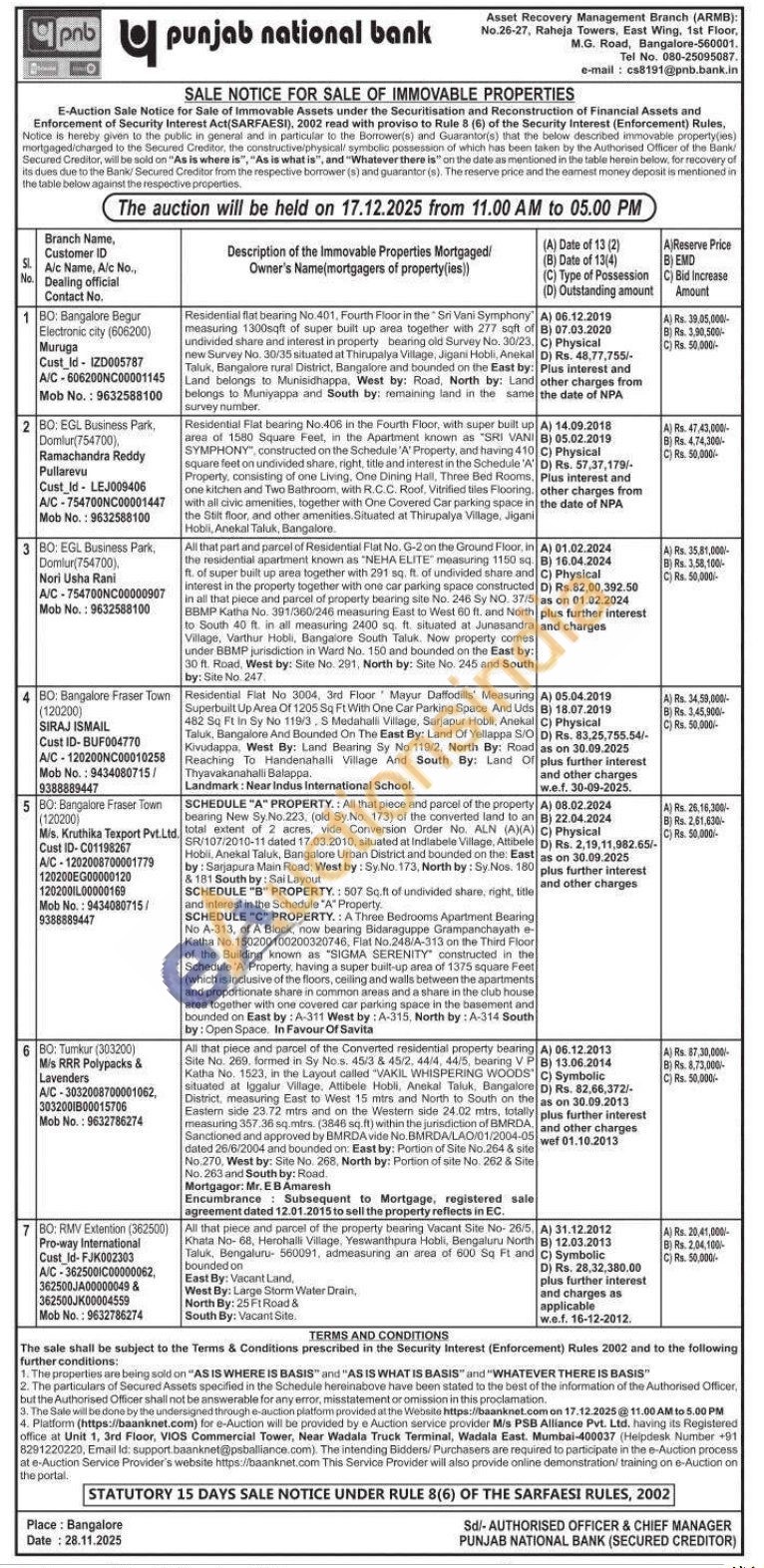 7) All that piece and parcel of the property bearing Vacant Site No-26/5, Khata No- 68, Herohalli Village, Yeswanthpura Hobli, Bengaluru North Taluk, Bengaluru 560091, admeasuring an area of 600 Sq Ft and bounded on East By: Vacant Land, West By: Large Storm Water Drain North By: 25 Ft Road & South By: Vacant Site