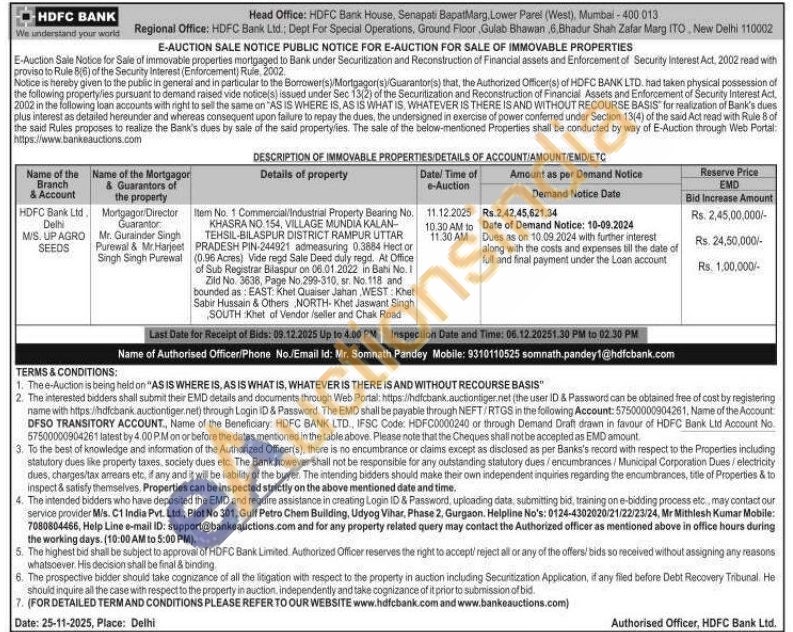 Item No. 1 Commercial/Industrial Property Bearing No. KHASRA NO 154, VILLAGE MUNDIA KALAN-TEHSIL-BILASPUR DISTRICT RAMPUR UTTAR PRADESH PIN-244921 admeasuring 0.3884 Hect or (0.96 Acres) Vide regd Sale Deed duly regd. At Office of Sub Registrar Bilaspur on 06.01.2022 in Bahi No. 1 Zild No. 3638, Page No.299-310. sr. No.118 and bounded as: EAST: Khet Quaiser Jahan, WEST: Khet Sabir Hussain & Others NORTH-Khet Jaswant Singh SOUTH Khet of Vendor /seller and Chak Road