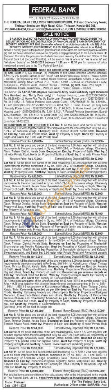 Lot No: 5: All the piece and parcel of the land measuring 2.51 Ares together with all other Improvements thereon comprised in Sy no. 407/1-24-13, of Kodakara Village, Chalakudy Taluk, Thrissur District, Kerala State. Bounded on East by: Property of Sajith, West by: Property of Jose, North by: Property of Sajith and 5 meter wide Private Road and South by: Property of Alappattu Joju