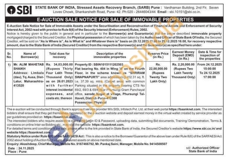 Flat bearing No. 404 in Wing 'A' on the Fourth Floor, in the scheme known as "SHRIRAM SWAPNAPURTI" area admeasuring 402.31 sq. ft. 10. 37.39 sq. mtrs. (Carpet area) with common Parking situated in the property bearing CTS No 69/2, 69/3 & 69/4 near Phursungi Gram Panchayat office, sarode Nagar at village, Phursungi Tal-Haveli, District-Pune-412308