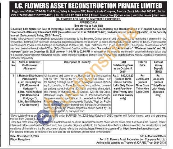 All that piece and parcel of the Residential apartment bearing Flat No. 1054, PID No. 55-771-20/19, inLevel-5 of Block-1 of the building "Prestige South Ridge", havingbuilt up area of 2005 sq. ft., consisting of Three Bedrooms, along with two covered car parking space, including 1524 sq. ft. undivided share, right, site, interest in Municipal No. 20 (Old no. 125/43), 4th Cross, Dattatreya Nagar, B8MP Ward No. 55, Padmanabhariagar, Bangalore measuring 413682 sq. ft., bounded on the: East by Property belonging to Kempegowda Society, West by: Public Road, North by: Property belonging to Bangalore Development Authority, South by: Private properties earlier owned by Sn Lakshmaiah and Sri S. Narayana Rao