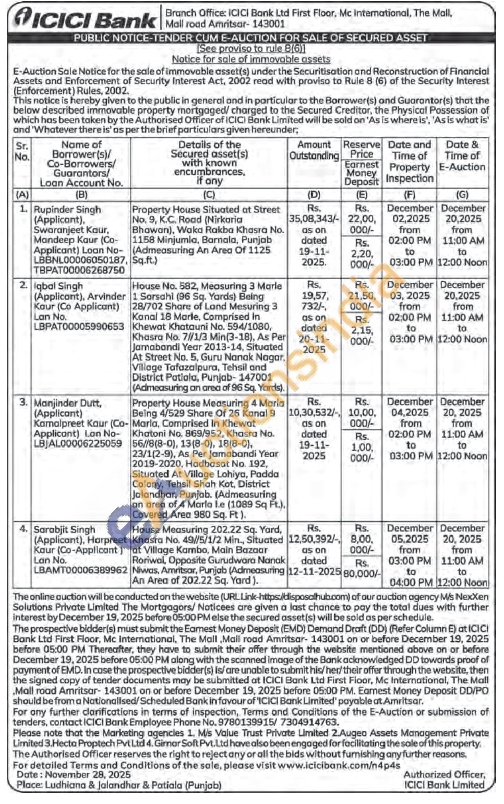 1) Property House Situated at Street Sq.ft.) No. 9, K.C. Road (Nirkaria Bhawan), Waka Rakba Khasra No. 1158 Minjumla, Barnala, Punjab (Admeasuring An Area Of 1125