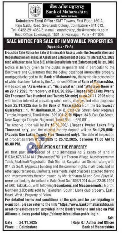 All that part and parcel of land admeasuring 2 cents of land in R.S.No.676/1A1A1A1 (Previously 676/1) in Theroor Village, Akastheeswaram Taluk, Edalakudi Registration Sub District, Kanyakumari District, along with 814.63 Sq.ft. (Approx.) building and the common rights in all roads and all other appurtenances, usufructs, easements, right of access attached thereto and improvements thereon owned by Mr.Hariharan.M and Smt. Vijaya.M, more particularly described in Sale Deed No. 1803/1994 dated 22.08.1994 of SRO, Edalakudi, with following Boundaries and Measurements: North: Northern 3.03cents sold by Rajendran, South Lions club property, East Road. West: Property of Balan.