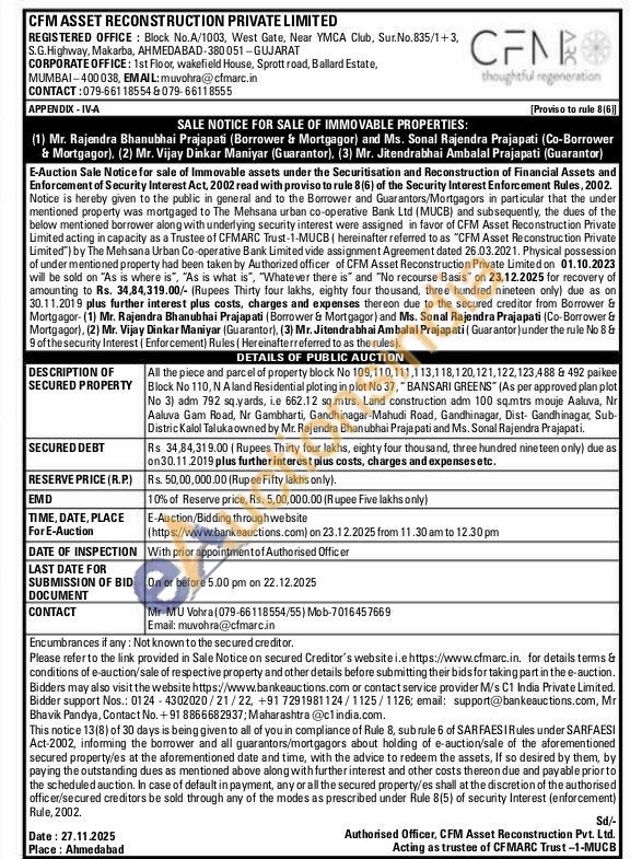 All the piece and parcel of property block No 109, 110, 111, 113,118, 120, 121, 122, 123,488 & 492 paikee Block No 110, N Aland Residential ploting in plot No 37, "BANSARI GREENS" (As per approved plan plot No 3) adm 792 sq.yards, ie 662.12 sq.mtrs. Land construction adm 100 sq.mtrs mouje Aaluva, Nr Aaluva Gam Road, Nr Gambharti, Gandhinagar-Mahudi Road, Gandhinagar, Dist- Gandhinagar, Sub-Distric Kalol Taluka owned by Mr. Rajendra Bhanubhai Prajapati and Ms. Sonal Rajendra Prajapati