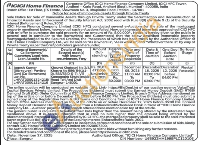 Khewat Khatauni No 2/4, Khasra No 586/54/1(1-0), 588/58(0-0-7), Vill Kamomajra Khurd Inside Road Teh And Distt Sangrur-148001