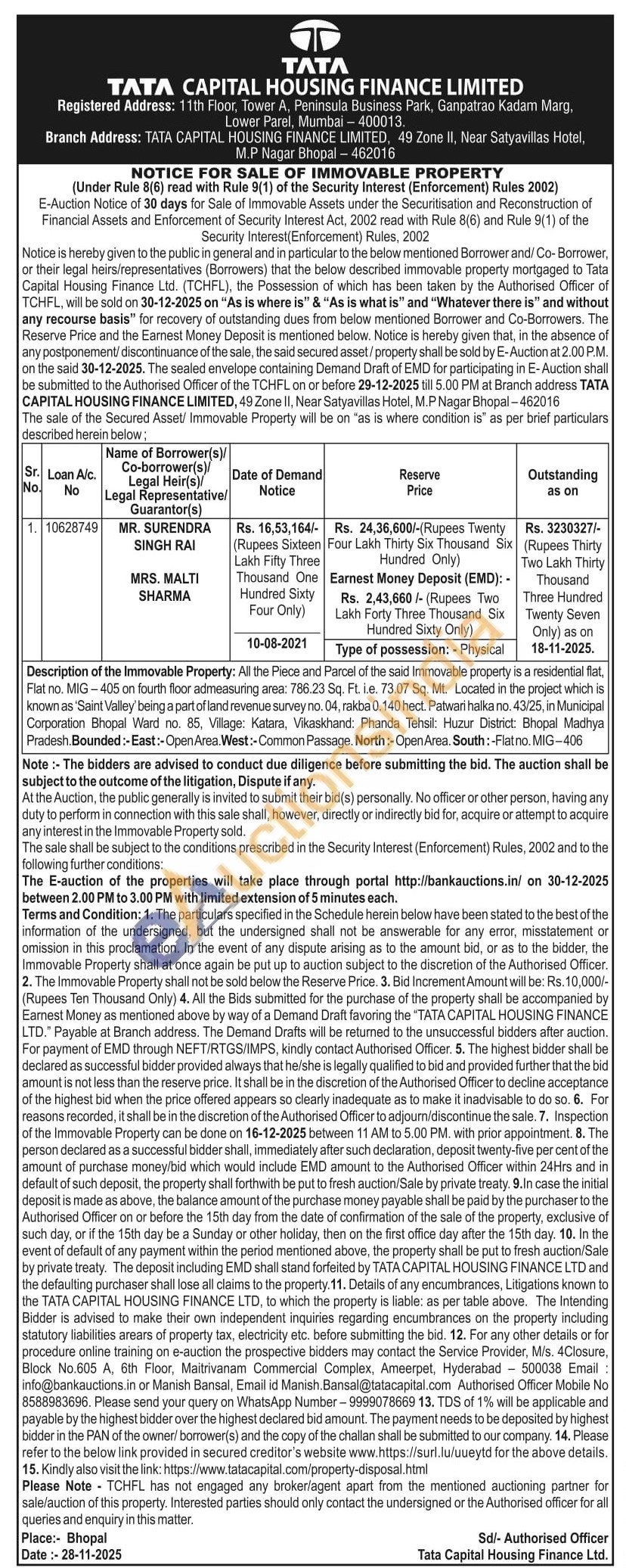 All the Piece and Parcel of the said Immovable property is a residential flat, Flat no. MIG-405 on fourth floor admeasuring area: 786.23 Sq. Ft. i.e. 73.07 Sq. Mt. Located in the project which is known as 'Saint Valley' being a part of land revenue survey no. 04, rakba 0.140 hect. Patwari halka no. 43/25, in Municipal Corporation Bhopal Ward no. 85, Village: Katara, Vikaskhand: Phanda Tehsil: Huzur District: Bhopal Madhya Pradesh.Bounded:-East:-Open Area. West: Common Passage. North: Open Area. South: -Flatno. MIG-406