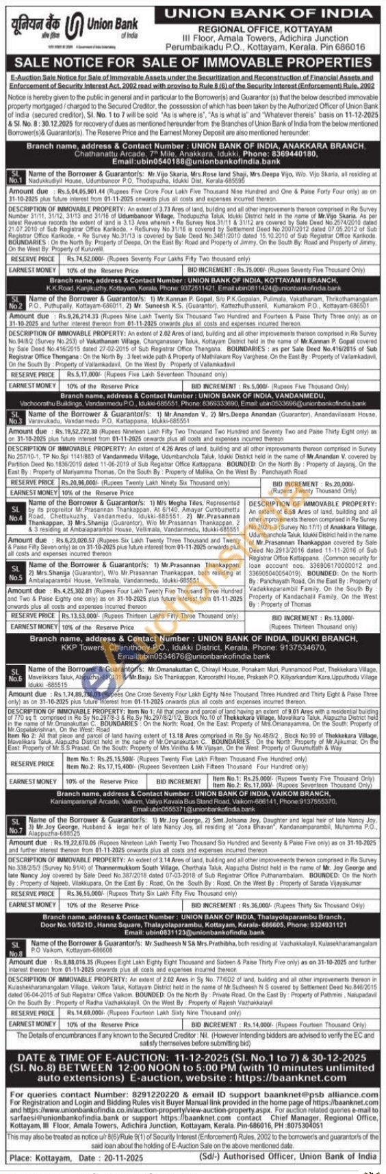 8) An extent of 2.02 Ares in Sy No. 77/602 of land, building and all other improvements thereon in Kulashekharamangalam Village. Vaikom Taluk, Kottayam District held in the name of Mr. Sudheesh NS covered by Settlement Deed No.846/2015 dated 06-04-2015 of Sub Registrar Office Vaikom BOUNDED: On the North By: Private Road, On the East By: Property of Pathmini, Nalupadavi On the South By: Property of Radha Vazhakkalayll, On the West By: Property of Rajesh Vazhakkalayi