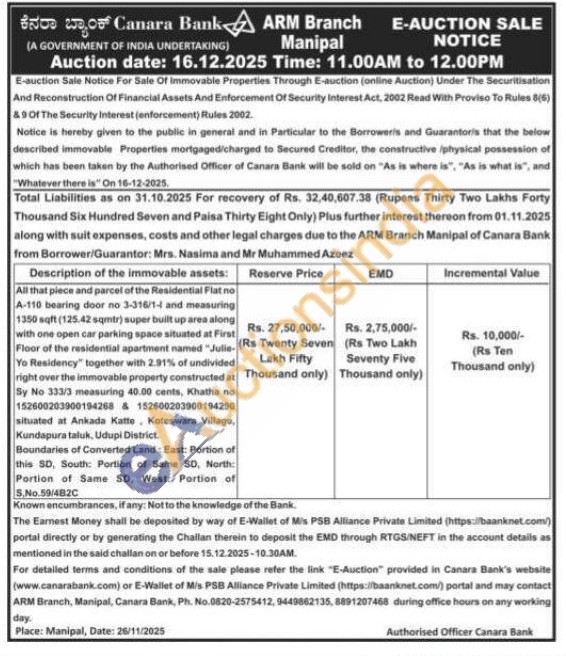 All that piece and parcel of the Residential Flat no A-110 bearing door no 3-316/1-4 and measuring 1350 sqft (125.42 sqmtr) super built up area along with one open car parking space situated at First Floor of the residential apartment named "Julie Yo Residency together with 2.91% of undivided right over the immovable property constructed at Sy No 333/3 measuring 40.00 cents, Khatha no 152600203900194268 & 152600203900194200 situated at Ankada Katte Koteswara Village, Kundapura taluk, Udupi District.Boundaries of Converted Land: East: Portion of this SD, South: Portion of Same SD, North: Portion of Same SD, West: Portion of