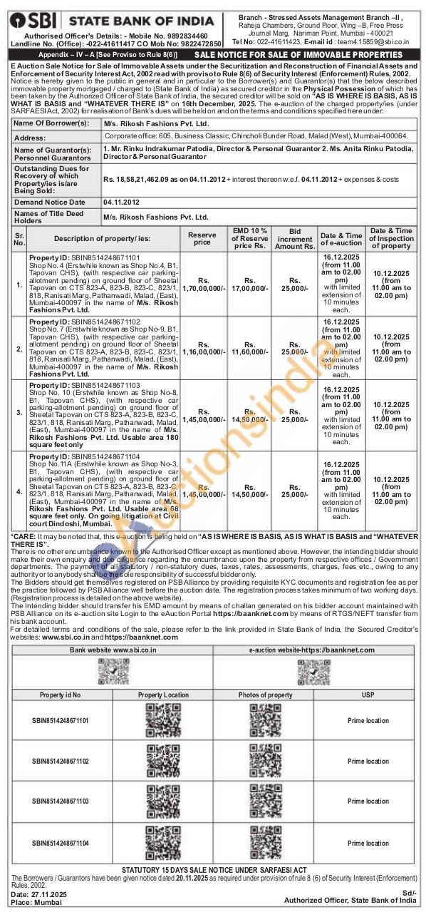 1) Shop No. 4 (Erstwhile known as Shop No.4, B1, Tapovan CHS), (with respective car parking-allotment pending) on ground floor of Sheetal Tapovan on CTS 823-A, 823-B, 823-C, 823/1, 818, Ranisati Marg, Pathanwadi, Malad, (East), Mumbai-400097 in the name of M/s. Rikosh Fashions Pvt. Ltd.
