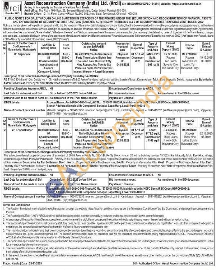 Description of the Secured Asset being auctioned: Property owned by KRISHNAKUMAR The subject residential property comprises of an extent of 08.09 Ares in Re Sy No 390/1/B, Re Sy Block number 20 with a building number 15/152 in karthikapally Taluk, Keerikkad village. Malamellbaagam Muri, Pathiyoor Panchayath-Athirthy, in the Sub district of karnyilakkulangara, Alappuzha District as described in the schedule to settlement deed number 1030/2018 in the name of Krishnakumar Boundaries As Per Settlement Deed: North: Property of kalikkal Madhavan Nair: South: Property of Visvanatha Pilia, West: Property of Madhusoodhanan Pila: East: Property of SK Krishnan and path way. Boundaries As Per Location Sketch: North: Property of Madhavan pilla, South: Property of Kesavan Nair, West: Property of Madhusoodhanan Piša East: Property of S K Krishnan and path way