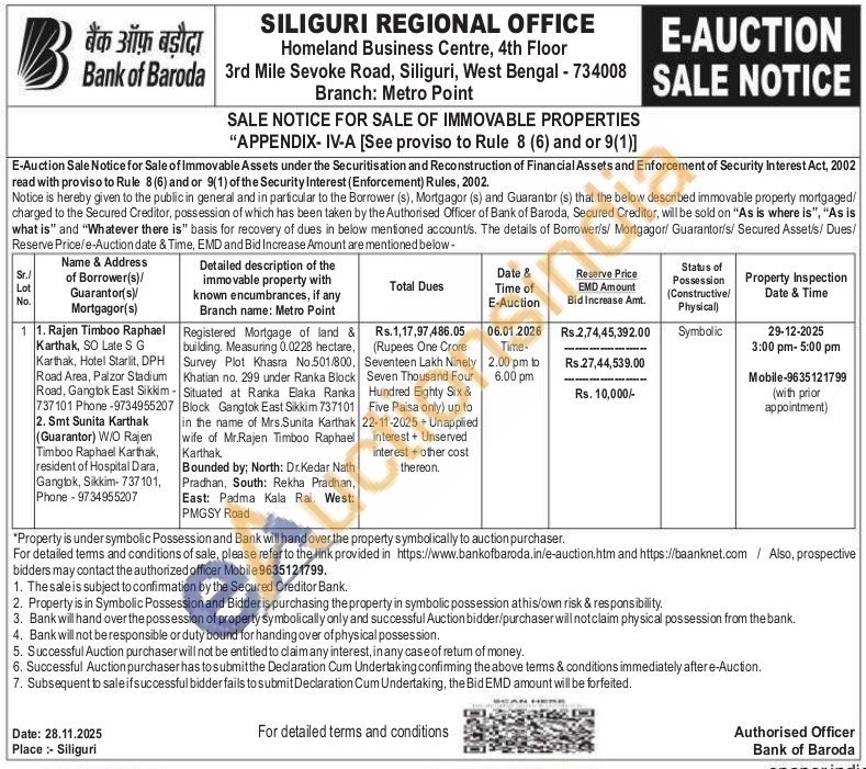 Registered Mortgage of land & building. Measuring 0.0228 hectare, Survey Plot Khasra No.501/800, Khatian no. 299 under Ranka Block Situated at Ranka Elaka Ranka Block Gangtok East Sikkim 737101 in the name of Mrs.Sunita Karthak wife of Mr.Rajen Timboo Raphael Karthak