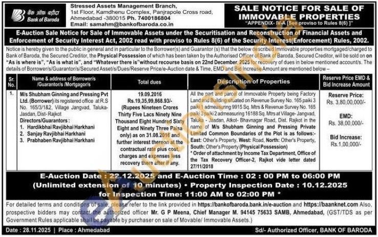 All the part and parcel of Immovable Property being Factory Land and Building situated on Revenue Survey No. 165 paiki 3 paiki 1 admeasuring 9915 Sq. Mtrs & Revenue Survey No. 165 paiki 3 paiki 2 admeasuring 16188 Sq. Mtrs at Village-Jangvad, Taluka Jasdan, Atkot- Bhavnagar Road, Dist. Rajkot in the name of Mis Shubham Ginning and Pressing Private Limited Common Boundaries of the Plot is as follows:-East: Other's Property, West: Road, North: Other's Property, South: Other's Property (Physical Possession)